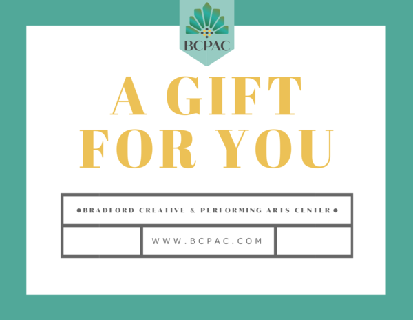 This gift certificate can be used for any upcoming events. Must be used within a year of issue date. Gift certificates are redeemable online or at the BCPAC ticket office.